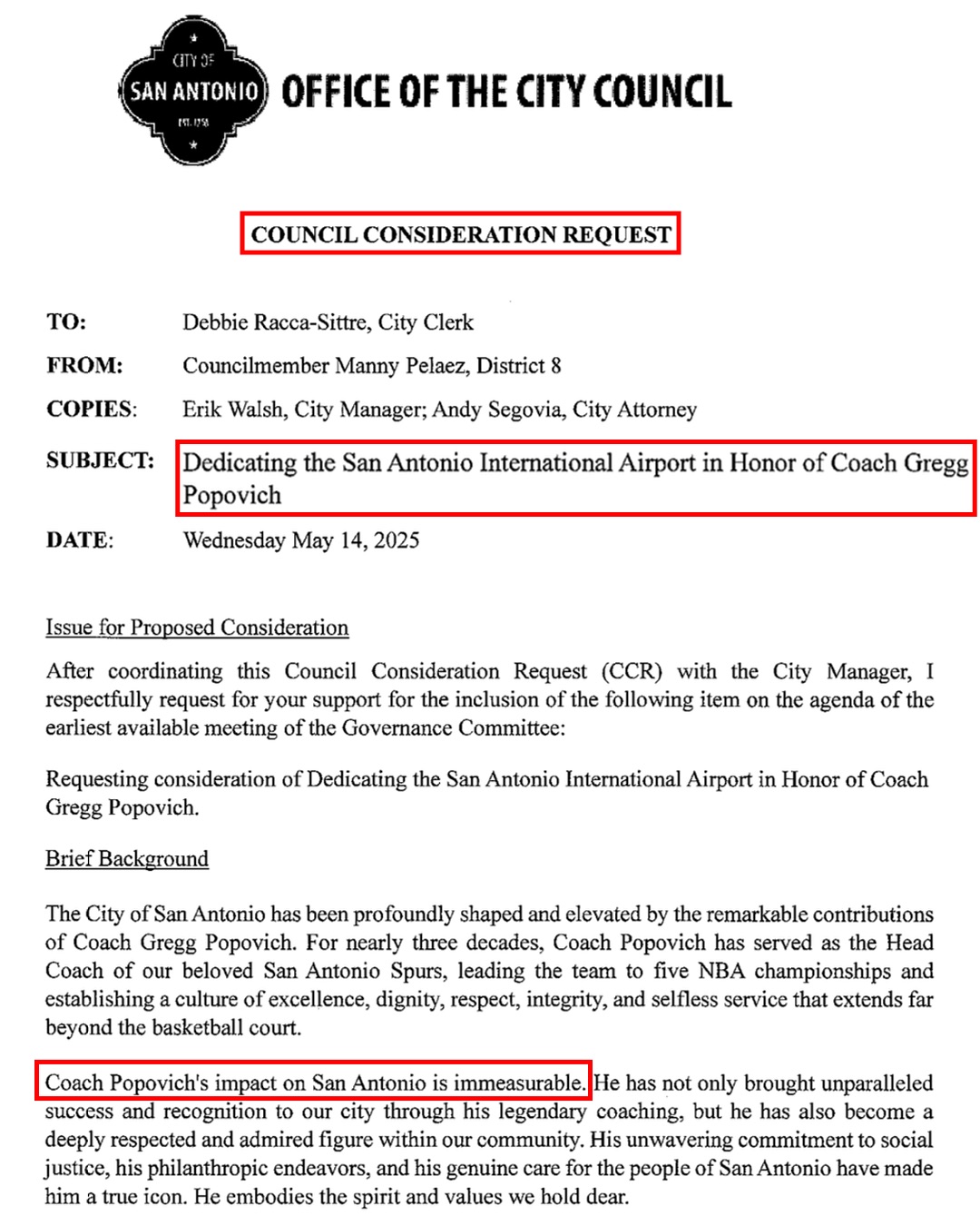 05月17日讯 一位圣安东尼奥议员正式发起提议,要求用马刺总裁&前主帅格雷格-波波维奇的名字命名圣城机场。该议员认为,波波维奇对城市的影响力是“无法估量”的。目前圣城机场的名字是“圣安东尼奥国际机场”。